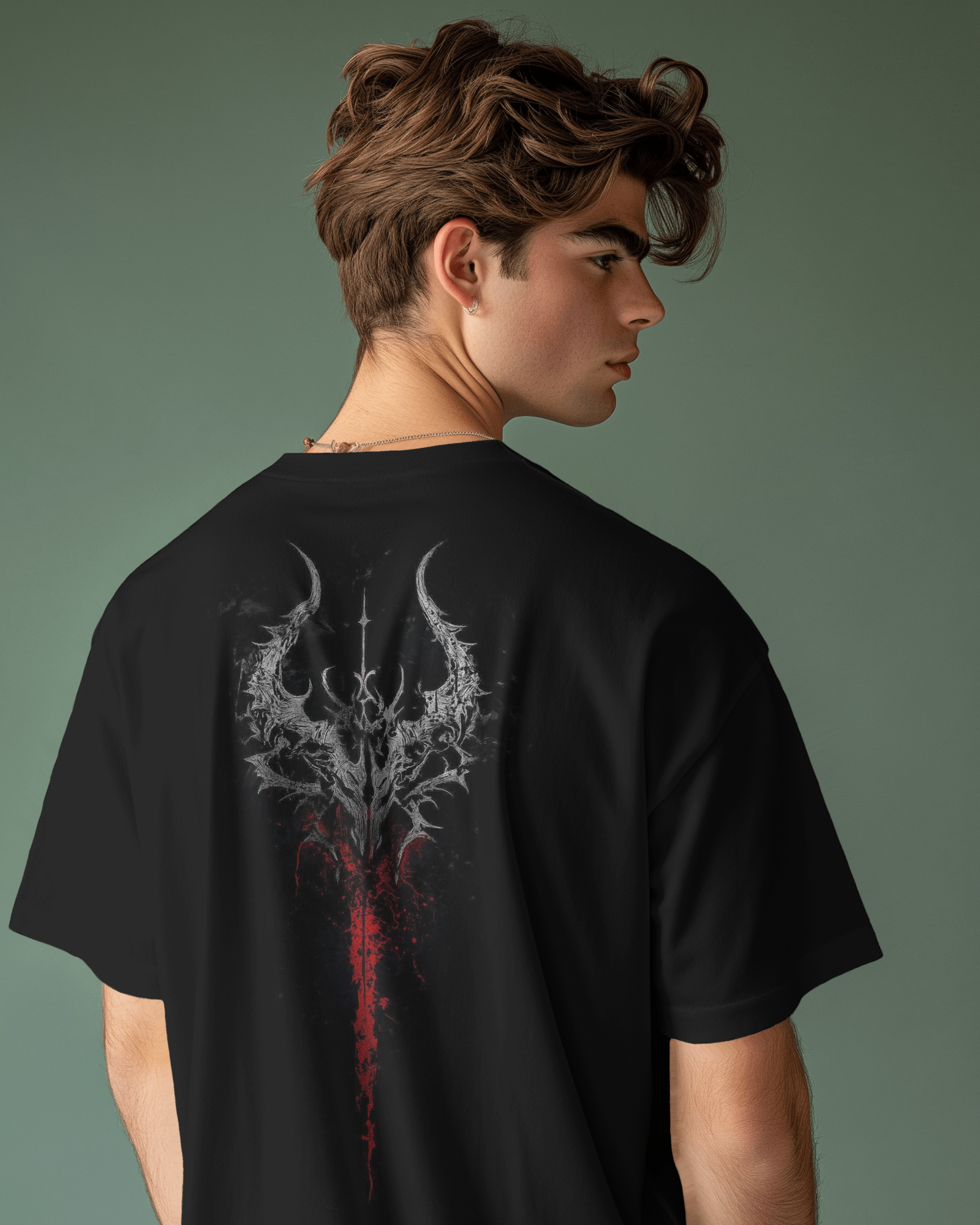 Embrace the shadows with the Shadow Trident Oversized Tee. This striking back-print graphic features an intricate, skeletal trident or demonic spear, melting into a dramatic vertical streak of deep crimson "blood." It evokes ancient power, fallen kingdoms, and dark fantasy narratives. Perfect for those who prefer the gothic aesthetic and the lore of the unknown. Make a powerful statement when you turn your back.